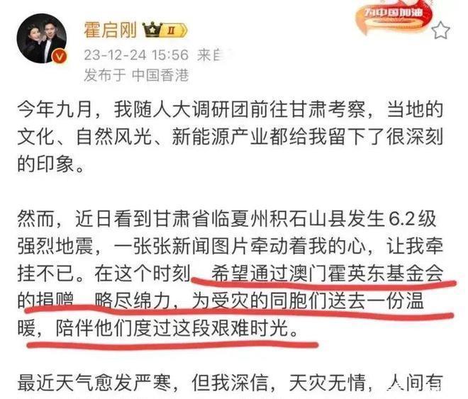 12月24日,霍启刚在酬酢账号上发文,回复、清醒向灾地捐钱7000万外传平博龙虎斗,激发烧议。网友:真纯碎神色!