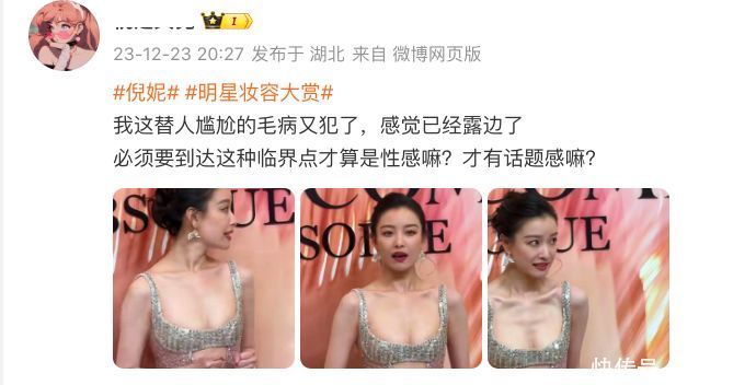 干系词,高清像片中似乎有网友发现了倪妮胸前的一些窘态思路,引起了一些柔顺和吐槽。一些网友戏弄示意,倪妮大概是为了追求更多的柔顺而挑升擦边:“我这替东说念主窘态的罪状又犯了,感觉还是露边了,必须要到达这种临界点才算是性感嘛?才有话题感吗?”