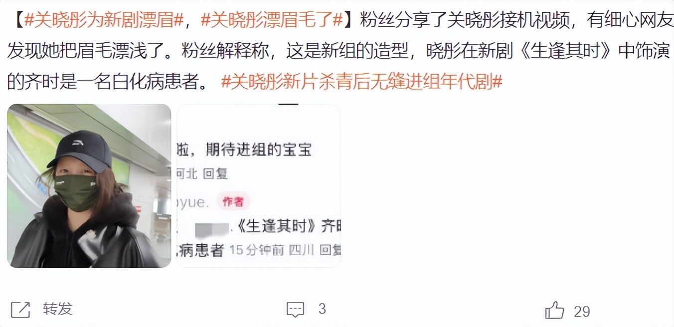 近日,网友们拍到关晓彤现身机场的视频,那时许多网友都合计关晓彤的景象不太好,但仔细不雅察之后,关晓彤竟我方的眉毛作念漂白解决,因为她出演《生逢其时》中的女主是白化病患者。